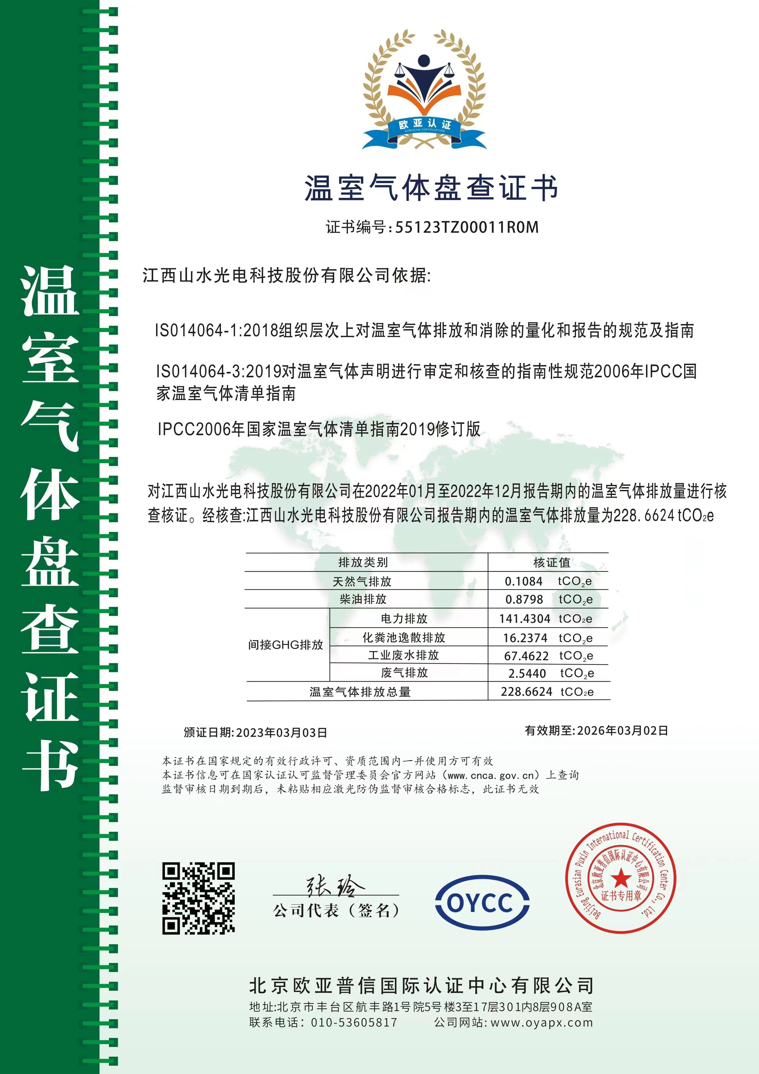 江西山水光電科技股份有限公司2022年度碳排放信息已通過北京歐亞普信國際認證中心核查并認證,相關證書見附件。